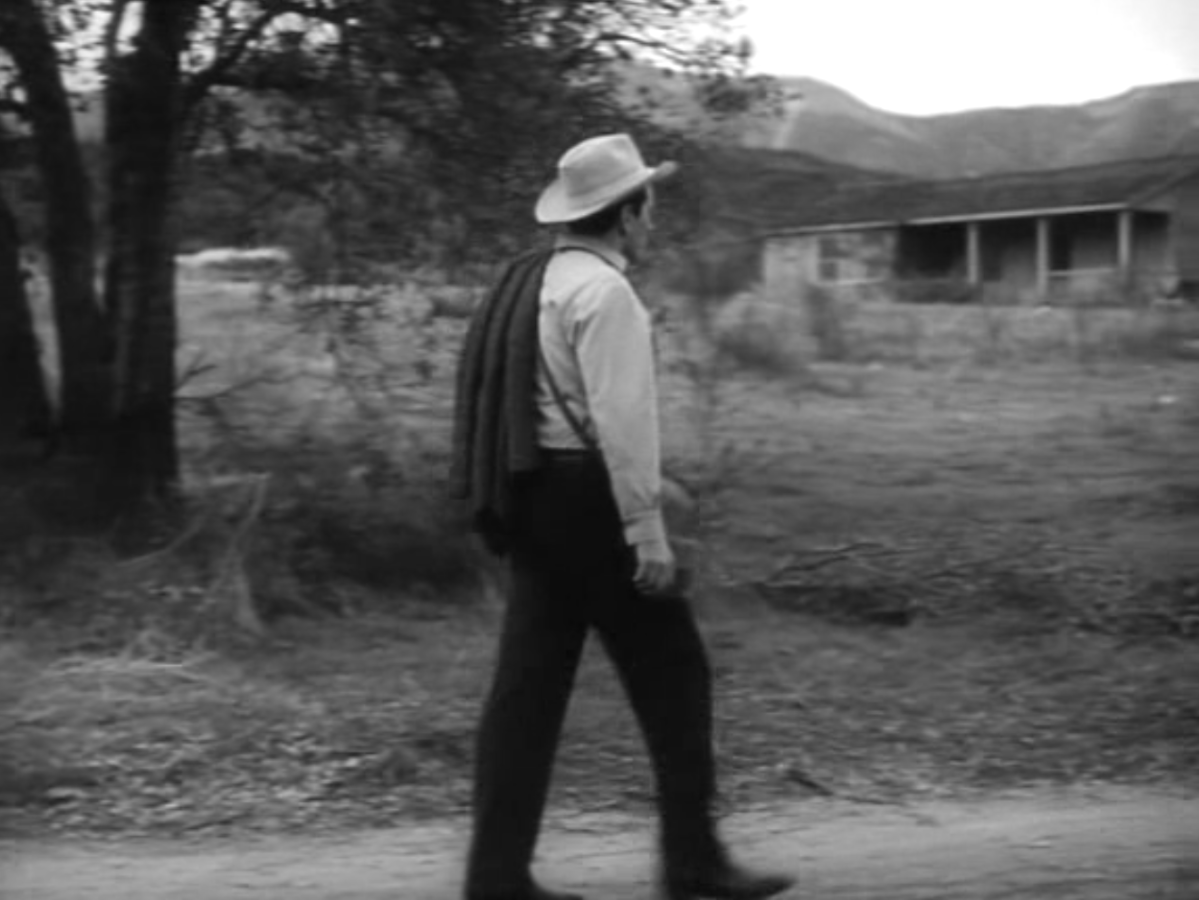 Trees E and F — the two main Midway Oaks that did not survive — make appearances in the "Zane Grey" episode, where John Forsythe walks along the east-west road below them — Road A. In the above shot, Forsythe has begun walking east along Road A. Tree E stands at the intersection of Roads A and B, and a portion of Road B can be seen behind it.